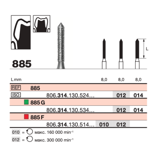 Алмазный бор E 885 SC 314.012 – профессиональный инструмент, который используется для высокоточной обработки зубных тканей, подготовки полостей и поверхностей к реставрационным манипуляциям или коронкованию. Применяется в терапевтической и ортопедической стоматологии, закрепляется в турбинном наконечнике, работая на скоростях до 450 000 об/мин.