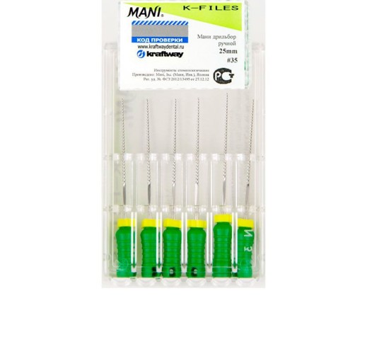 К-файл №35 Mani – специализированный ручной инструмент, применяемый в ортодонтии для лечения сложных клинических случаев кариеса. С его помощью, поступательными и вращательными движениями, вычищаются и расширяются зубные каналы.