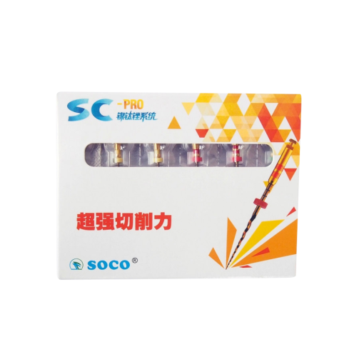 Машинные файлы SOCO SC Pro изготовлены из никель-титанового сплава с памятью формы. При длине 31 мм они отличаются исключительной гибкостью и способностью сохранять профиль канала. Инструменты обладают режущей боковой гранью и треугольным сечением. Прочность и эластичность материала минимизируют риск перелома рабочей части.