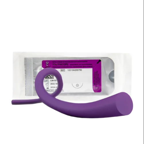 Материал Ультрасорб 4/0 применяется при наложении швов на мягкие ткани. Представляет собой моноволокно из сополимеров на основе капролактона и гликолида, которое саморассасывается со временем.